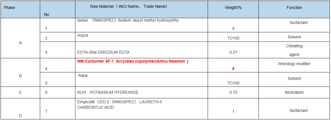 Including NM-Carbomer SF-1, Aqua10 and Aqua20, Aqua 25 , They are easy-to-use liquid and excellent tolerance surfactants which greatly improves formulation stability, are extensively applied for formulations containing high levels of surfactant such as shampoo, shower gels and cleansers.