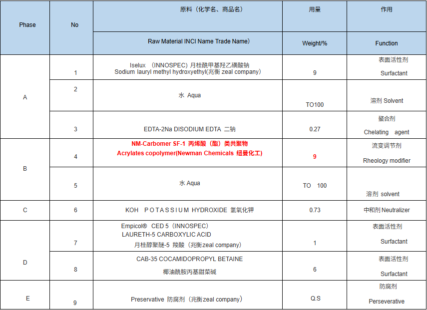 5)特殊的化学结构:引入疏水改性的共聚单体,与表面活性剂、胶束和疏水原料有较好的协同增稠作用,从而赋予高效的增稠性能,优异的耐盐性,特别适用 于高表面活性剂含量的配方体系中。纽曼卡波姆NM-Carbomer SF-1的INCI名称:丙烯酸(酯)类共聚物; NM-L 30的INCI名称:丙烯酸(酯)类/新癸酸乙烯酯交联聚合物;NM-Carbomer Aqua 10的INCI名称:丙烯酸(酯)类/硬脂醇聚醚-20 甲基丙烯酸酯共聚物; NM-Carbomer Aqua 20 的INCI名称:丙烯酸(酯)类/山嵛醇聚醚-25甲基丙烯酸酯共聚物;
